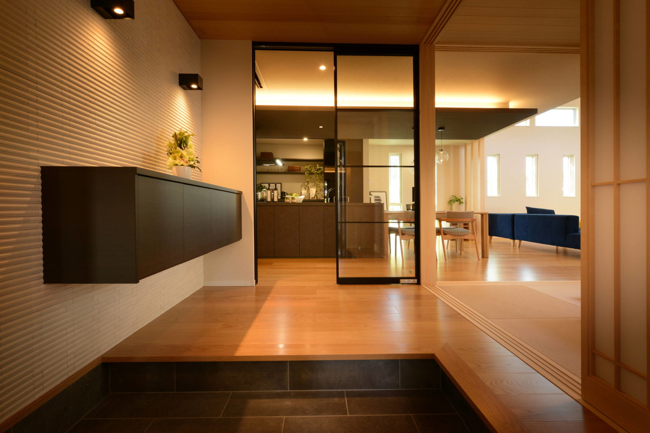 高級感漂う格子があるアプローチは外部と内部を緩やかに安全につなぎ、ご家族それぞれのライフスタイルに合わせた動線を確保しています。プライベート性が高い中庭から明るい陽射しがそそぐリビングは、開放的なくつろぎの空間。さらに、ZEH(ゼロエネルギーハウス)を採用し、環境にも家計にも優しいコンフォートなZEH を実現しています。